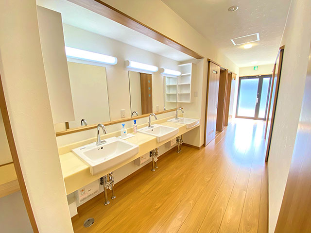 木調の材料を取り入れることで家に近い雰囲気をつくり出し、落ち着いて過ごせるような施設となりました。皆さんの集まる食堂からは西山が望め、秋は紅葉・冬は白化粧した雪山と季節を感じる事ができます。